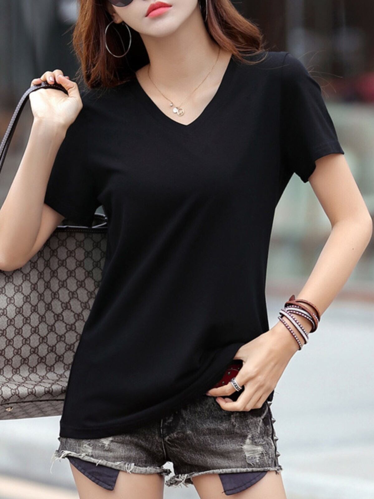 程よいカットのVネックはデコルテラインがきれいに見えるため、全体的にスタイルアップした印象に。